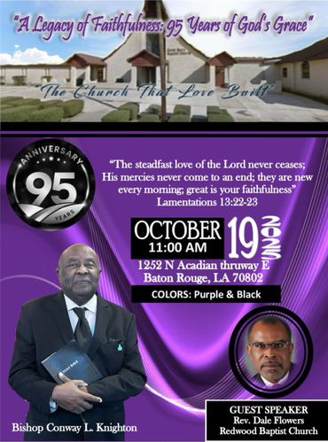 Join us for 11:00am to celebrate our 95th Church Anniversary. Colors Purple and Black. Guess preacher, Rev. Dale Flowers of Redwood Baptist...